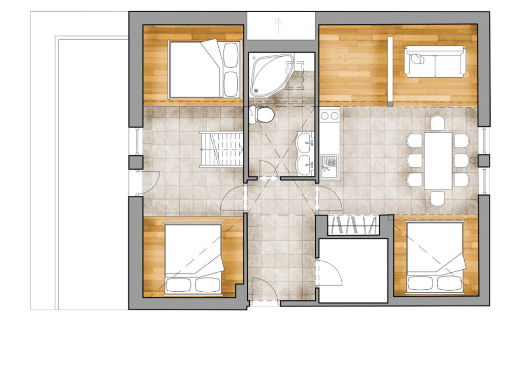 - pokoj č. 2 – dvě manželské postele a jedno dvojlůžko po schodech v patře
